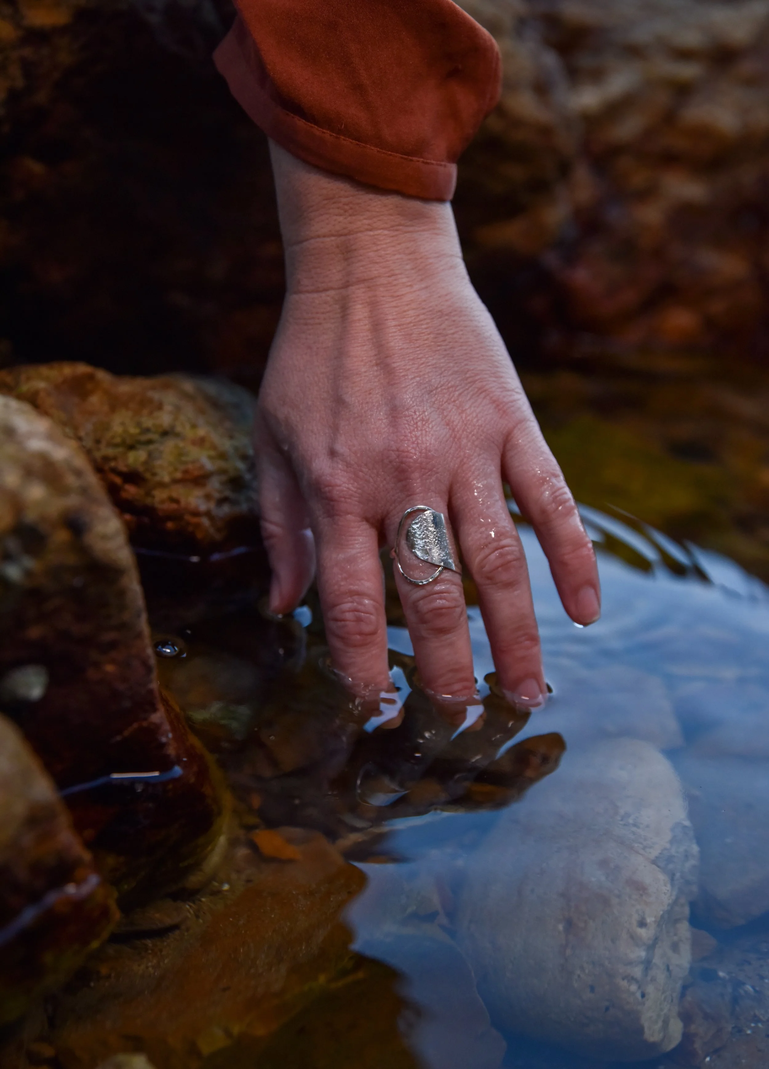 Grounded in close observation of the natural world, Tasmanian artist Karen of Hulley Jewellery creates pieces that invite us to wear the wild. Working primarily in sterling silver, she builds texture and irregularity for an organic, tactile feel. Her Boulder Collection reflects weathered coastal rocks, symbolising how life’s trials shape and strengthen us, revealing resilience. In other collections, she uses powder coats to reference overlooked elements such as lichen. Each piece is an expression of awe, presence, and intentional living.