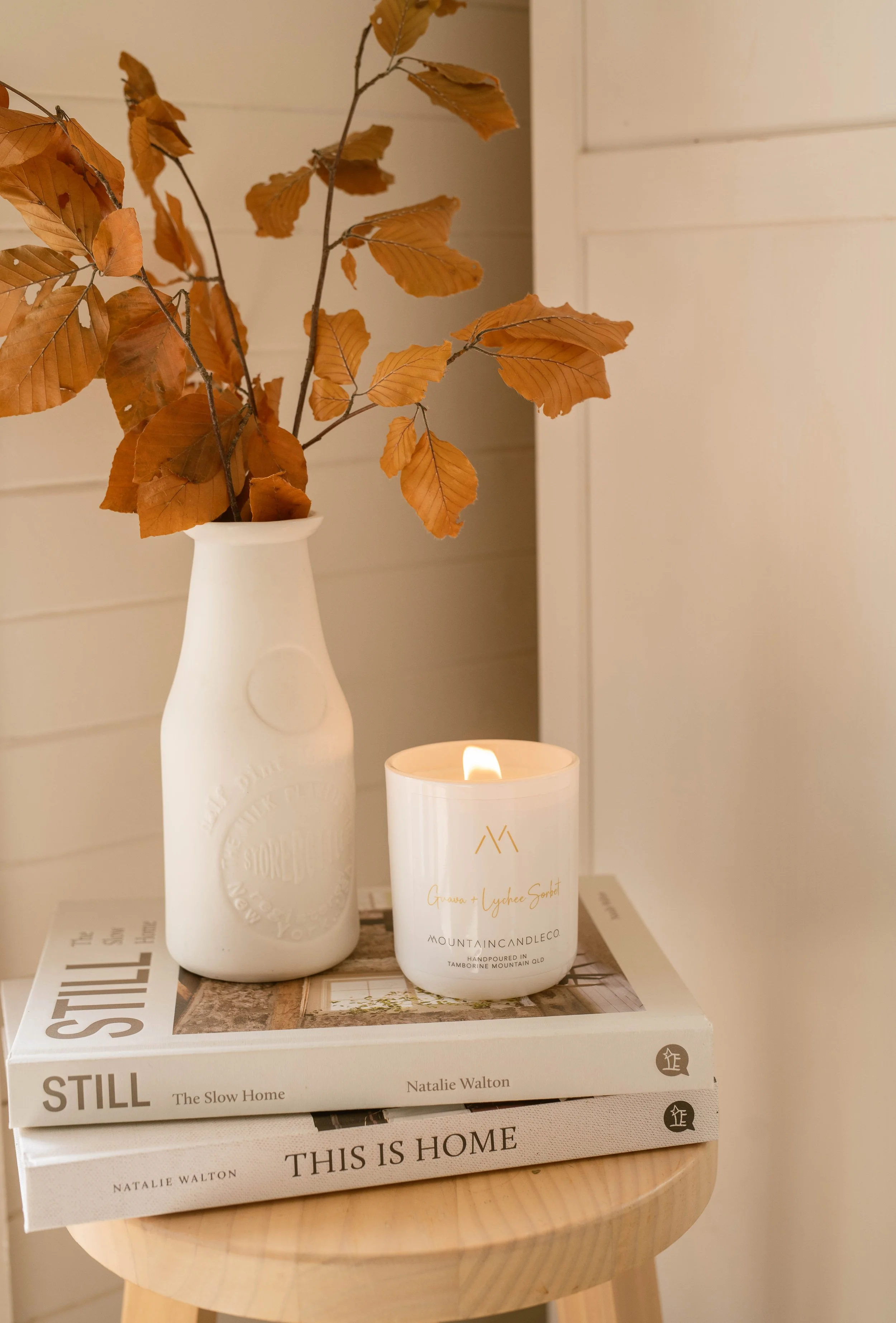 Our Collection of Retreat Candles are Australian Made, slowly made and hand poured by us, using beautiful wood wicks for that soothing crackle sound, along with 100% natural wax encased in our reusable vessels. These elements bring instant warmth and create a haven feel in the home, making your home a space that you enjoy being in.